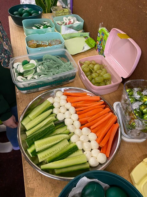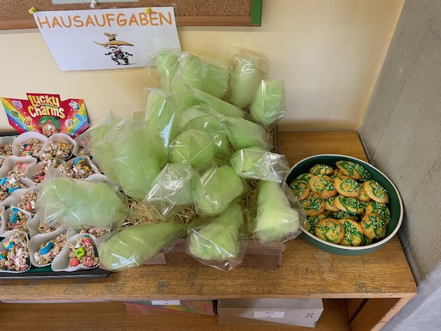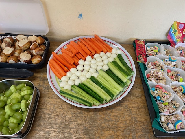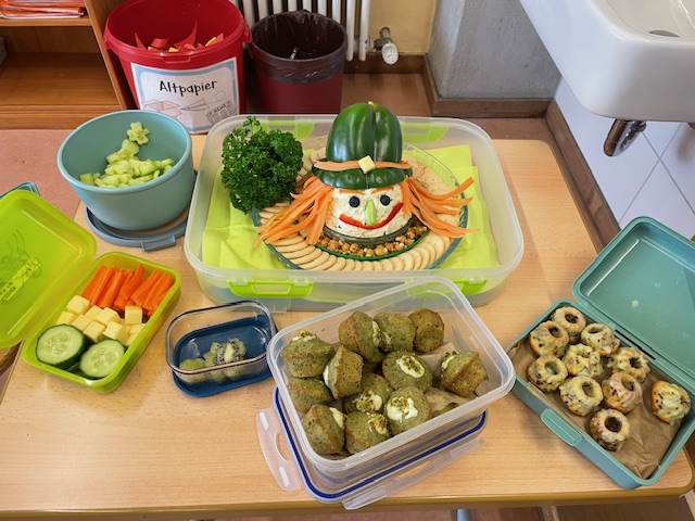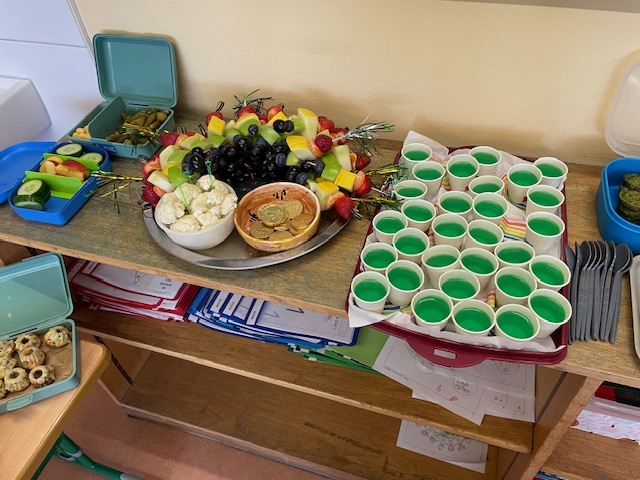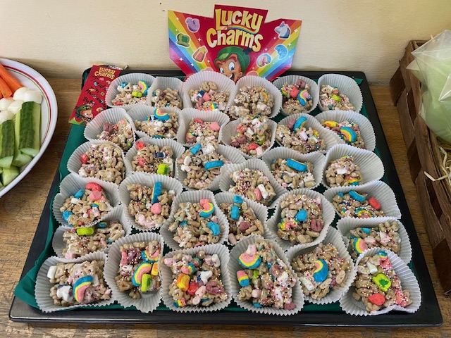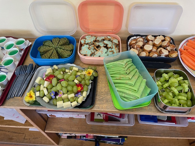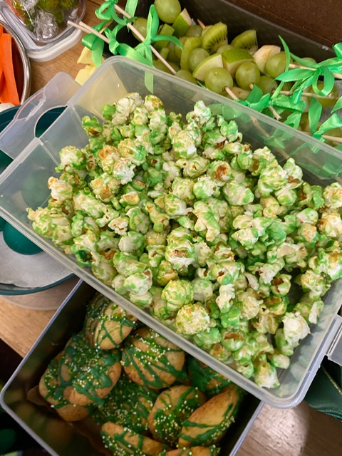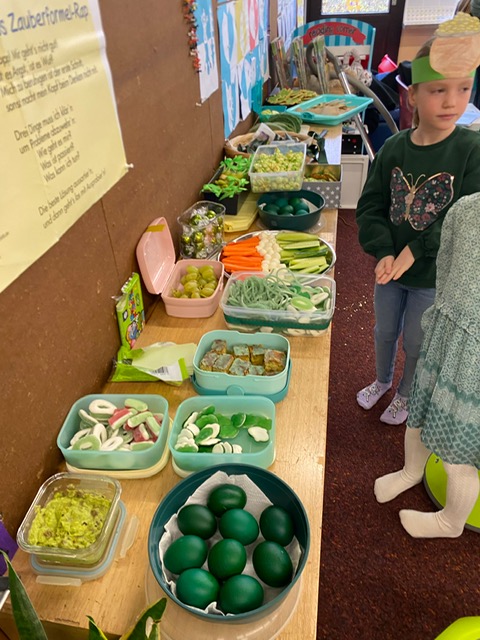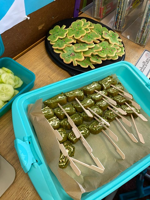 Ein liebevoll gestaltetes grünes Buffet lud zum Probieren ein. Neben vielen leckeren Snacks in verschiedenen Grüntönen gab es auch bunte Regenbogen-Motive, Kobolde und goldene „Schätze“, die für zusätzliche Begeisterung sorgten.